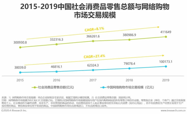 根據國家統計局和艾瑞統計數據顯示,我國網絡購物市場交易規模在過去五年中以27.4%的年復合增長率高速增長,遠超社會消費品零售總額同期8.1%的增速。即使電商平臺流量增長較平緩,消費者購物額卻在電商平臺優惠活動多、選品配送便捷、涵蓋商品品類全面等優點的促進下不斷高速增長,消費習慣進一步向線上遷移,而以消費者購物偏好為風向標而開展的品牌主/商戶營銷投放,也隨之更加倚重線上消費渠道,將電商平臺作為營銷的重要觸點。