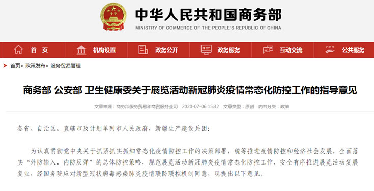 2020年7月3日,三部委(商務部、公安部、衛健委)對疫情下的展覽活動提出詳細的指導意見,7月6日在商務部網站公布,這可謂一石激起千層浪,為會展產業的全面復蘇帶來了真正福音。確切地說,這可以理解為2020年會展業真正復蘇的開端,意味著相應的一些審批程序將在審慎的氛圍中持續往前,這也意味著會展業前期的一些積極準備將進入開拔階段。