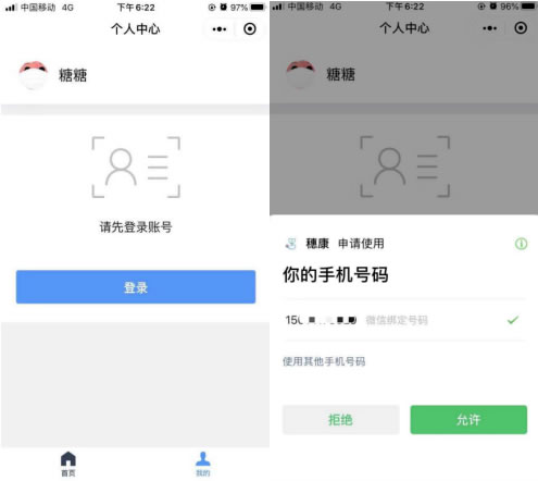 2. 初次登錄的通行人員,需綁定微信賬號,進(jìn)入“穗康”小程序后點擊“我的”,登錄并授權(quán)綁定手機(jī)號碼。