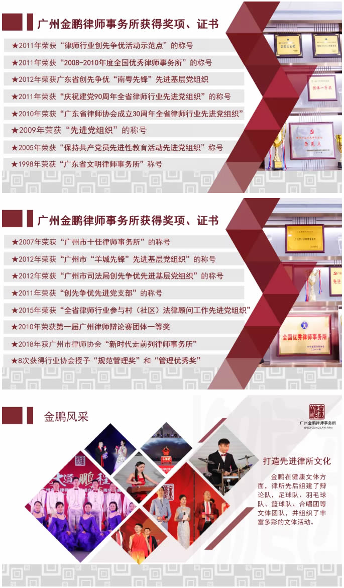 廣州金鵬律師事務所成立于1993年1月,是廣州第一家市屬合伙制律師事務所。1997年,經司法部批準,金鵬成為最早在美國洛杉磯設立辦事處的中國律師事務所。2006年,金鵬購置了珠江新城寫字樓,成為廣州市首家進駐中央商務區CBD的綜合大型律師事務所。2015年,金鵬成功獲批改制成為廣東省首批特殊普通合伙制律師事務所之一,為今后的大格局發展打下了堅實的基礎。經過穩健發展,金鵬已發展成為廣東地區最具規模的大型律師事務所之一,在全國法律界具有重要影響力。
