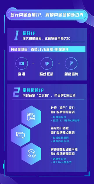 · 抖音信息流廣告:廣告展示在抖音信息流內容中,展現樣式原生、賬號關聯強聚粉,支持分享傳播方式靈活,支持多種廣告樣式和效果優化方式。