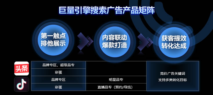 巨量引擎擁有豐富的內容生態,基于抖音、今日頭條等產品,為廣告主打造了整合多類型投放、多創新玩法、強內容聯動等優勢的搜索營銷產品矩陣,不僅為用戶帶來了整合巨量引擎全內容生態的搜索體驗、滿足用戶獲取信息的需求,也更有效地幫助品牌實現全場景占位與營銷提效,激發出移動搜索這一嶄新流量藍海的增長潛能。