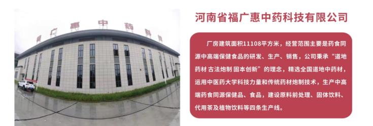 河南省福廣惠中藥科技有限公司廠房建筑面積11108平方米,經營范圍主要是藥食同源中高端保健,食品的研發、生產、銷售,公司秉承“道地藥材古法炮制固本創新”的理念,精選全國道地中藥材,運用中醫藥大學科技力量和傳統藥材炮制技術,生產中高端藥食同源保健品、食品,建設原料前處理、固體飲料、代用茶及植物飲料等四條生產線。