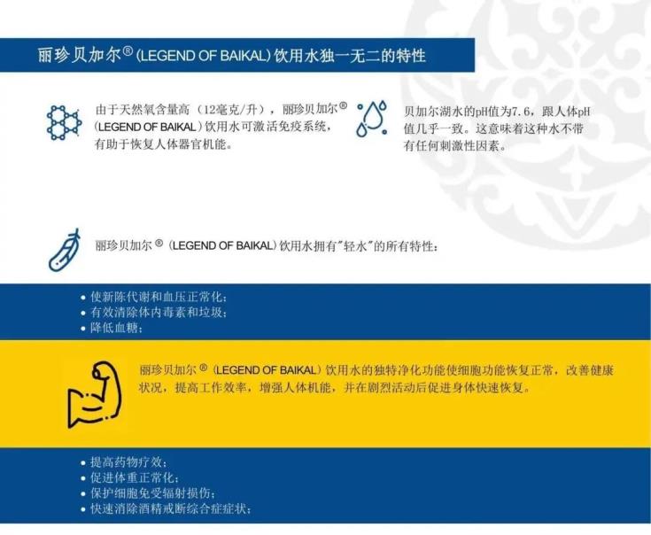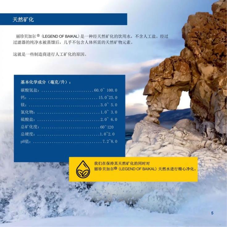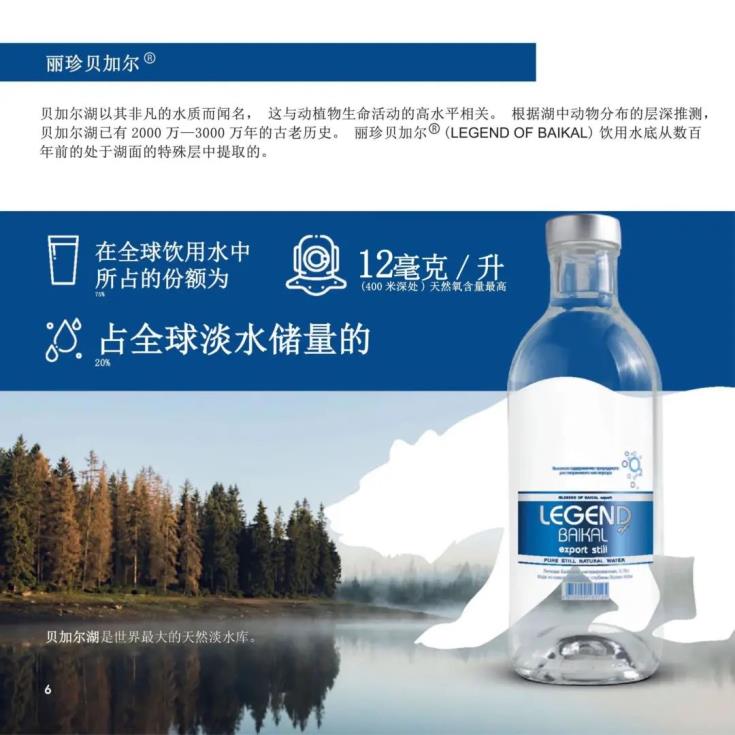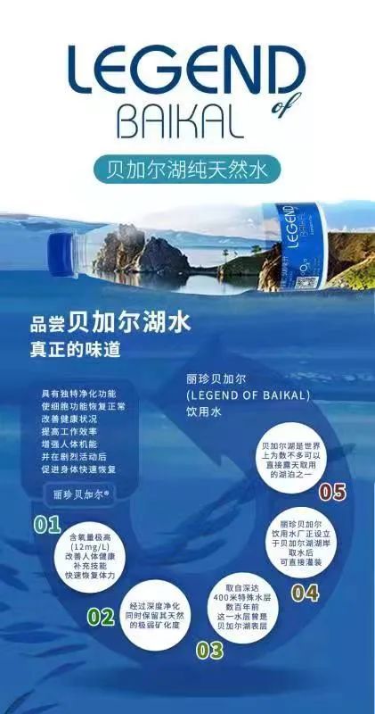 我司麗珍貝加爾?(LEGEND OF BAIKAL)純天然飲用水直接取自于貝加爾湖深水層,并經過精心凈化后傳送至裝瓶線,其水本身含氧量豐富,天然礦化保留了其天然的弱堿性。