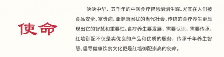 紅墻御配愿與社會各界有識之士精誠合作,攜手共進,共同在食療養生領域筑就一個航母般的領導企業。