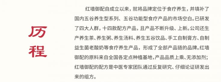 紅墻御配食療科技有限公司,隸屬紅墻國際集團旗下子公司,是一家專注于天然谷物養生食品研發、生產、銷售為一體的公司。15年始終如一,目前擁有直營店126家,合作店800多家,形成了品牌連鎖化運營。通過清、調、補、修、養五為一體的食療養生方案,享得千萬消費者的好評,真正實現個性化定制食療養生服務于大眾。秉承為消費者一對一的量身定制天然食補方案為宗旨,實現了中醫食補、健康教育、食養研發及產品銷售為一體的特色食療養生館。