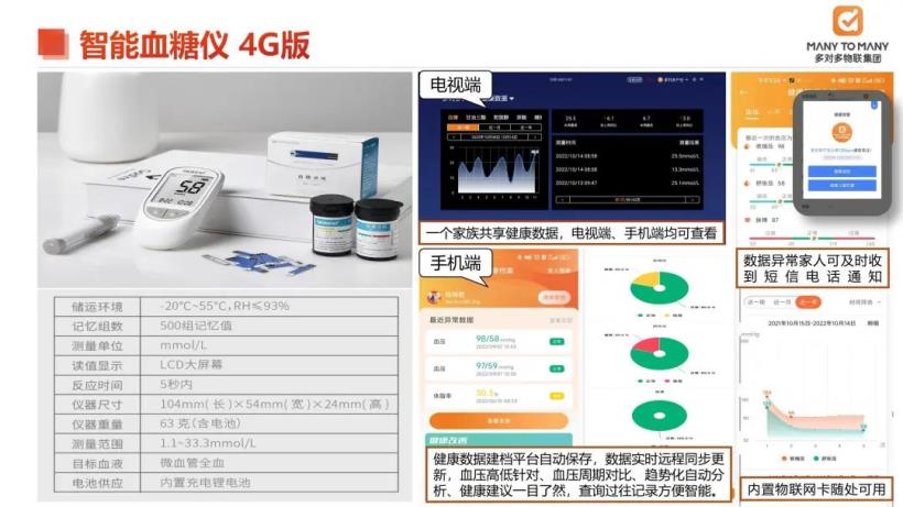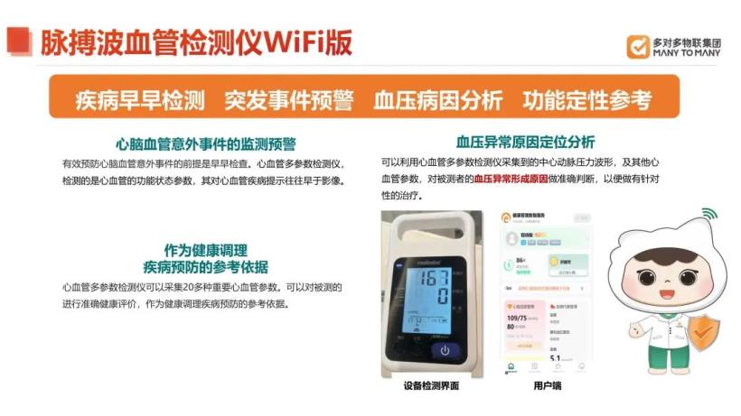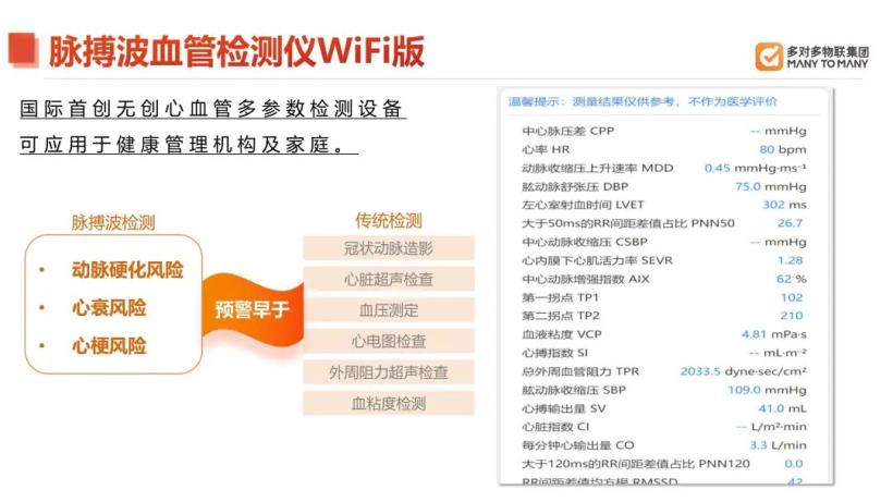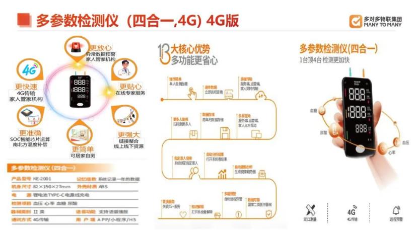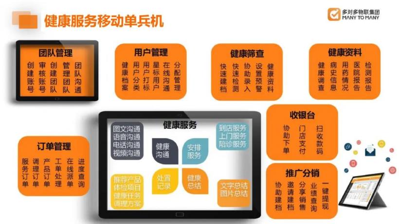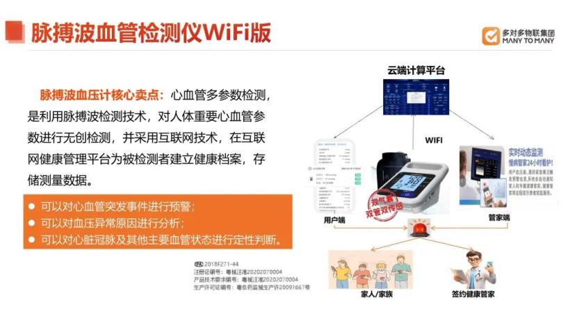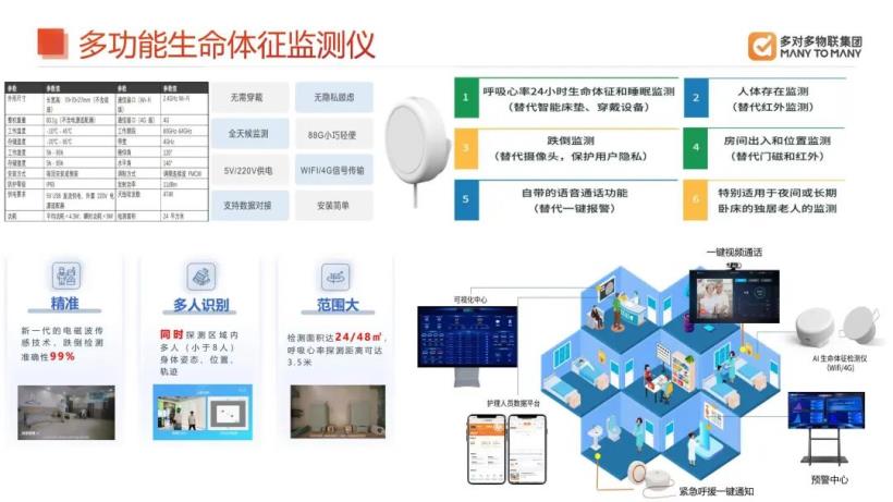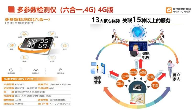 多對多物聯集團以“科技防大病·管慢病·促健康”為使命,為醫康養行業搭建了個高效精準服務每個家庭和組織的AI健康管理服務系統,賦能醫康養行業拓展增量業務,開展包括數智建檔、數據分析、健康評測、風險監測、預警干預、精準方案、效果評估、科普咨詢和AI互動等在內的健康服務,從而助力實現業績效益倍增。