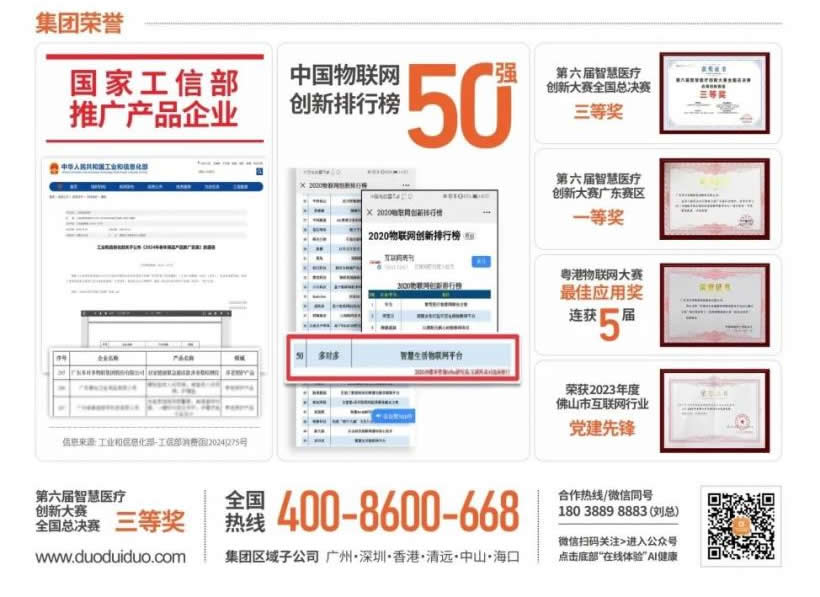多對多物聯集團在華為多年的戰略支持下,以物聯網(IoT)技術為基礎,人工智能(AI)分析與決策為中樞,并以多維度、連續性、動態化健康數據為核心驅動力構建的AI健康管理服務系統,深度融合DeepSeek算法推理大模型,完成了數智驅動的精準健康流量閉環,引領健康管理領域AI應用優勢。榮獲第六屆廣東省智慧醫療大賽一等獎、第六屆全國智慧醫療大賽三等獎、第十三屆粵港物聯網大賽最佳應用獎和2024日內瓦國際發明亞洲銀獎。