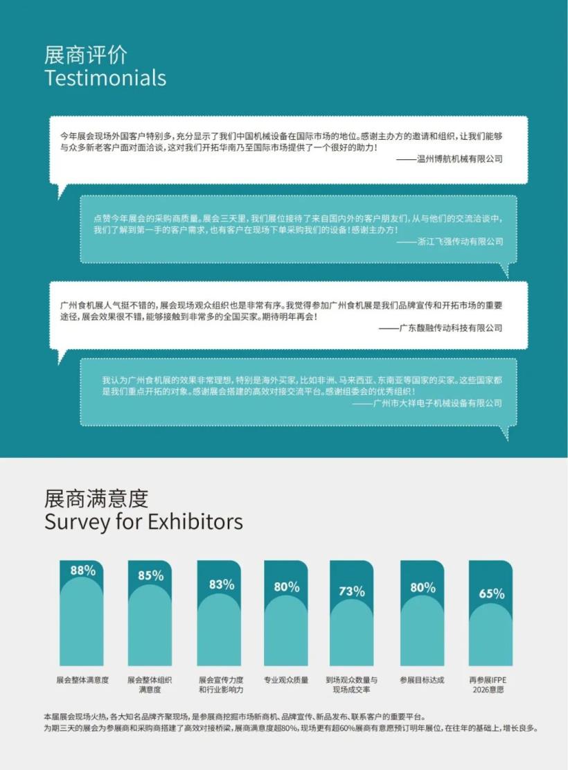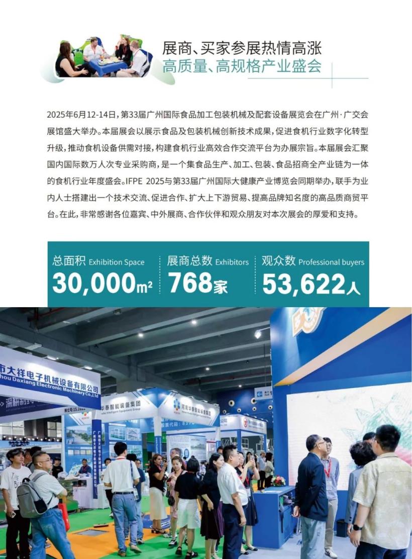 2025年6月12-14日,第33屆廣州國際食品加工包裝機械及配套設(shè)備展覽會在羊城廣州盛大舉辦。本次展會匯聚食品加工機械、食品包裝設(shè)備、食品飲料機械、包裝材料、配套器材、包裝印刷機械等眾多細分板塊的領(lǐng)軍企業(yè)和品牌。IFPE 2025以展示食品及包裝機械創(chuàng)新技術(shù)成果,促進食機行業(yè)數(shù)字化轉(zhuǎn)型升級,加快產(chǎn)業(yè)鏈上下游供需對接為辦展宗旨。展會精準(zhǔn)邀約數(shù)萬人次國內(nèi)外專業(yè)采購商參展,為食機產(chǎn)業(yè)搭建了一個高效合作對接交流平臺,獲得了廣大參展商和采購商的共同贊譽。