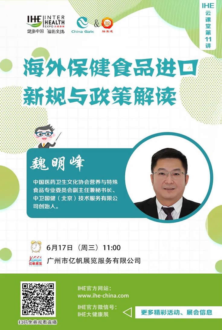 IHE China大健康云課堂每周邀請行業資深專家授課,分享行業干貨,多維度解決客商痛點。本期有幸邀請到中國醫藥文化協會營養營養與特殊食品專業委員會副主任兼秘書長、中衛國建(北京)技術服務公司創始人魏明峰先生做客云課堂直播間,給大家帶來“海外保健食品進口新規與政策解讀”!