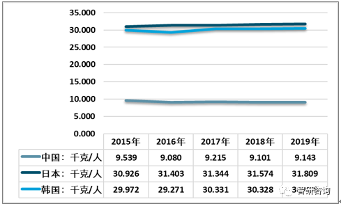 2013-2019年中日韓人均牛奶消費量情況。資料來源:USDA、世界銀行