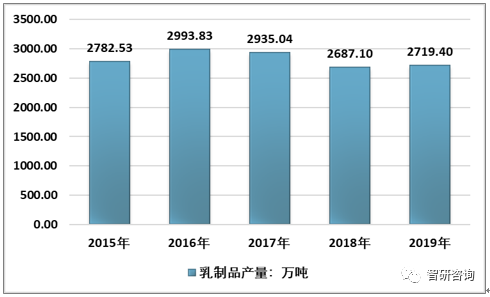 2015-2019年中國乳制品產量情況。資料來源:國家統計局