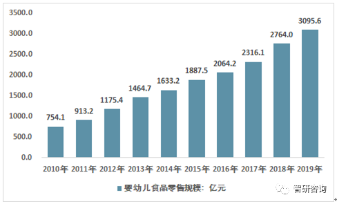 近幾年,我國嬰幼兒食品市場規模快速增長,從2009年的754.1億元增長到了2019年的3095.6億元。