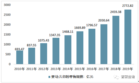隨著國內居民收入水平的提升,消費觀念的轉變,國內嬰幼兒奶粉市場規模呈穩步增長態勢,產業規模從2010年的693.47億元增長至2019年的2772.82億元。
