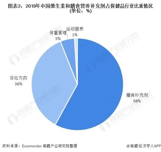 根據(jù)Euromonitor數(shù)據(jù),2019年我國(guó)維生素和膳食補(bǔ)充劑行業(yè)收入規(guī)模達(dá)1449.9億元,占保健品行業(yè)產(chǎn)品規(guī)模的54%,占據(jù)主要比重。