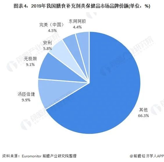 由于我國(guó)膳食補(bǔ)充劑仍然是作為一個(gè)新興行業(yè),所以盡管市場(chǎng)產(chǎn)品類型豐富,但整體而言,同質(zhì)化水平較高,可替代性強(qiáng),導(dǎo)致膳食補(bǔ)充劑市場(chǎng)處于十分分散的狀態(tài)。頭部企業(yè)湯臣倍健與無(wú)極限市場(chǎng)份額不到10%。