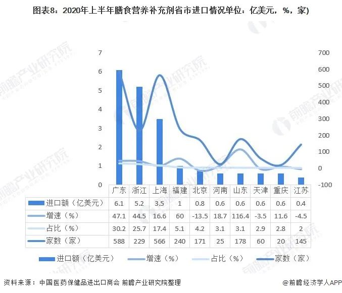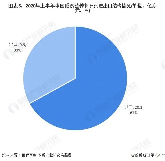 由于我國(guó)膳食營(yíng)養(yǎng)補(bǔ)充劑仍有待發(fā)展,故我國(guó)大量依靠進(jìn)口。據(jù)醫(yī)保商會(huì)統(tǒng)計(jì),2020年上半年中國(guó)膳食營(yíng)養(yǎng)補(bǔ)充劑進(jìn)出口總額達(dá)到了30億美元,其中進(jìn)口額占比達(dá)67%;出口貿(mào)易在經(jīng)歷疫情影響前期下滑后又快速回彈,達(dá)9.9億美元,同比增長(zhǎng)了10.4%,從事出口貿(mào)易的企業(yè)1743家,同比增長(zhǎng)4.4%。