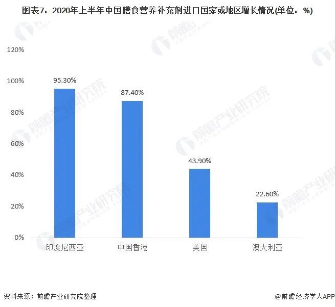 我國(guó)膳食營(yíng)養(yǎng)補(bǔ)充劑食用水平低于世界平均水平,在中國(guó),膳食營(yíng)養(yǎng)補(bǔ)充劑還是一個(gè)新興的行業(yè),導(dǎo)致我國(guó)膳食補(bǔ)充劑市場(chǎng)較為分散,故我國(guó)膳食營(yíng)養(yǎng)補(bǔ)充劑大量依靠進(jìn)口,2020年上半年進(jìn)口膳食補(bǔ)充劑貿(mào)易增幅大,我國(guó)膳食營(yíng)養(yǎng)補(bǔ)充劑作為新興行業(yè),尚處于起步發(fā)展階段,未來(lái)發(fā)展空間巨大。