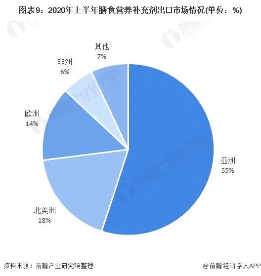 我國(guó)也適當(dāng)出口膳食營(yíng)養(yǎng)補(bǔ)充劑,主要出口市場(chǎng)是亞洲,其次為北美洲和歐洲,2020年上半年出口三大洲總共占87%的份額,集中度高。其中亞洲的出口額為5.4億美元,較大幅度增長(zhǎng),同比增長(zhǎng)了20.3%,占比55%。亞洲市場(chǎng)中,中東市場(chǎng)具有較大的出口潛力,同比增長(zhǎng)了43.1%。歐洲市場(chǎng)中,歐盟是主要的出口市場(chǎng)。