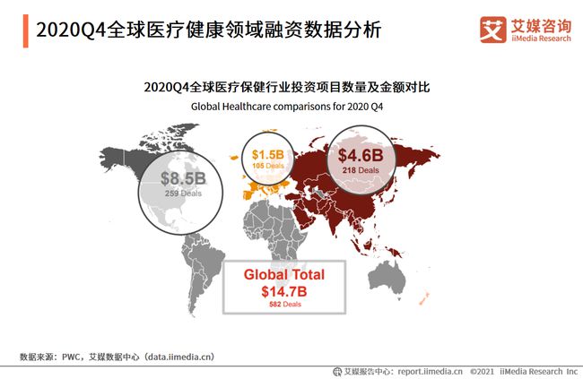 艾媒咨詢研究發(fā)現(xiàn),2020年第四季度全球醫(yī)療健康領(lǐng)域投資項目數(shù)共582起,投資總額約147億美元。其中美洲投資項目數(shù)量和金額最高,分別為259起和85億美元;亞洲緊隨其后,投資項目數(shù)量共218起,融資金額共46億美元。