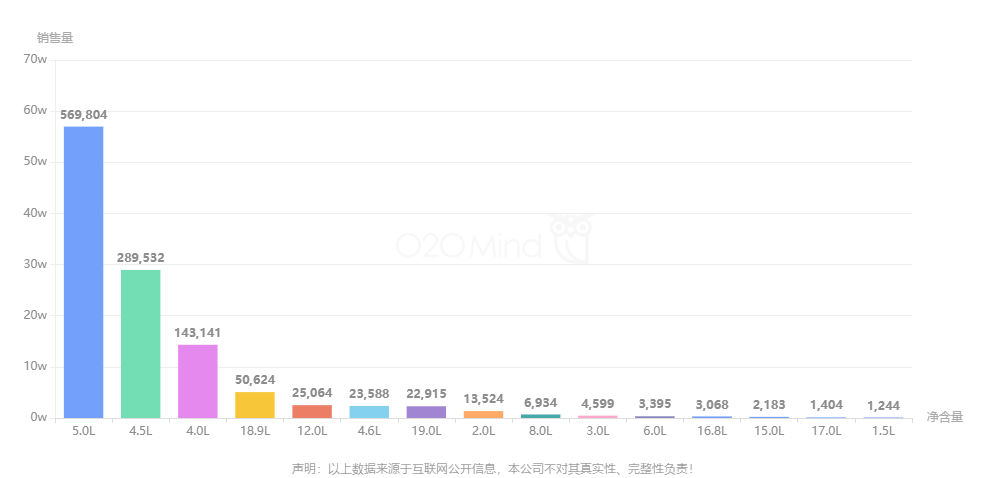 而在O2O市場,中大規格包裝飲用水表現同樣不俗。據O2OMind數據顯示,2021年3月包裝飲用水各大O2O平臺銷售額前三為5.0L、550mL、4.0L等中大規格包裝飲用水。