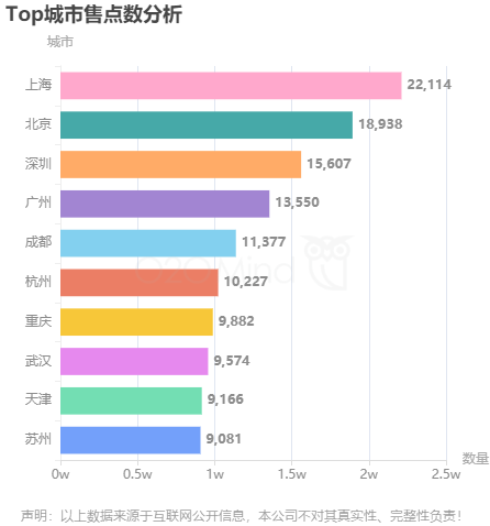 包裝飲用水在O2O售點數較多的一線、新一線城市銷量較高。據O2OMind 2021年3月數據顯示,上海擁有兩萬多個O2O售點,該城市O2O市場包裝飲用水銷量最高,達330.18萬,北京214.75萬次之。