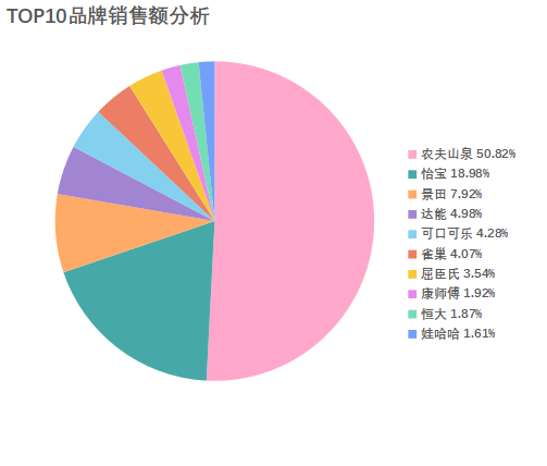 其次是華潤怡寶月總銷售額為2762.81萬元,占比18.98%;景田占比7.92%排名第三。