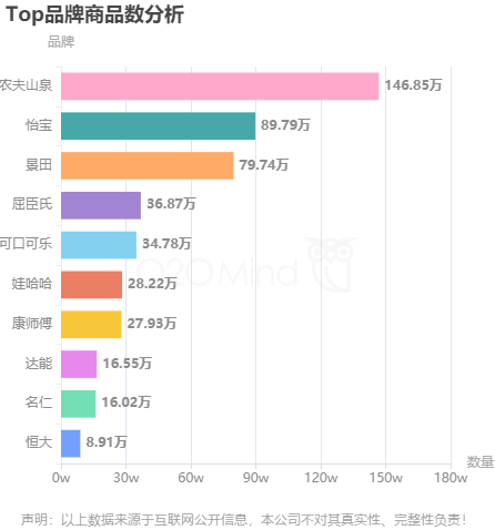 農夫山泉包裝飲用水商品數最多,達146.85萬,可供消費者選擇更豐富,其次是怡寶和景田,兩品牌包裝飲用水商品數量為89.79萬、79.74萬。