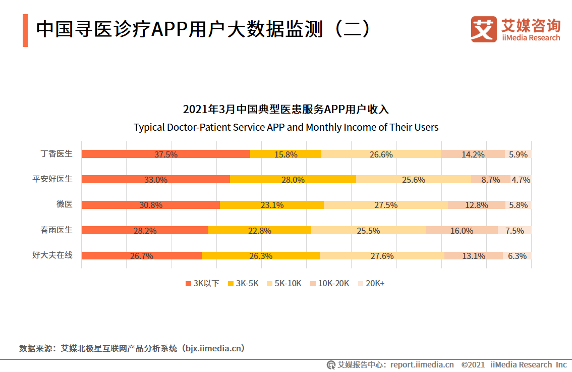 各主流尋醫(yī)診療移動(dòng)應(yīng)用的用戶畫像分布差異不大,中低收入的消費(fèi)人群是主流用戶。該用戶群體規(guī)模大,主要是30歲以下的人群,消費(fèi)能力具有上升空間,對(duì)于低成本的醫(yī)療信息獲取和基本健康服務(wù)有較大需求。在性別分布方面則有細(xì)微差別,好大夫在線和微醫(yī)的女性用戶比例更高。