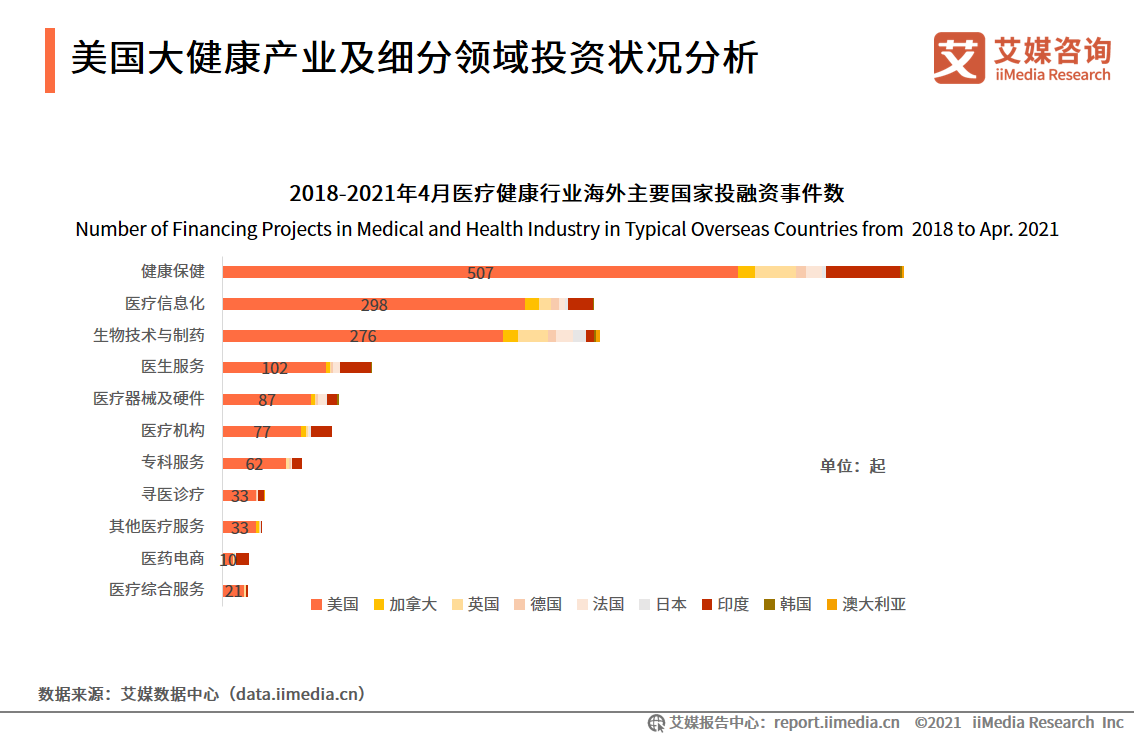 艾媒咨詢研究發(fā)現(xiàn),美國(guó)在大健康產(chǎn)業(yè)各細(xì)分領(lǐng)域的投資比重都比較大,其中,健康保健、醫(yī)療信息化和生物技術(shù)與制藥是投資熱度較高的領(lǐng)域。