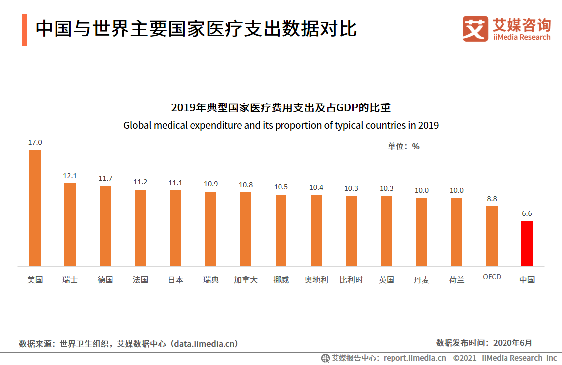 數(shù)據(jù)顯示,美國(guó)、瑞士、德國(guó)、法國(guó)等歐美發(fā)達(dá)國(guó)家醫(yī)療衛(wèi)生支出占GDP的比重普遍超過10%,OECD國(guó)家平均為8.8%,中國(guó)目前僅占比6.6%,相比之下仍有很大提升空間。艾媒咨詢分析師認(rèn)為,隨著中國(guó)成為世界重要的經(jīng)濟(jì)體,中國(guó)的產(chǎn)業(yè)結(jié)構(gòu)及醫(yī)療發(fā)展也會(huì)逐漸趨近于美國(guó)、德國(guó)等,因此中國(guó)的醫(yī)療支出還有很大的增長(zhǎng)空間。