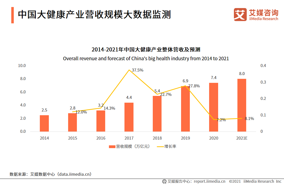 數(shù)據(jù)顯示,2014年到2020年,中國(guó)的大健康產(chǎn)業(yè)整體營(yíng)收保持增長(zhǎng),2020年?duì)I收規(guī)模超過7萬億元,預(yù)計(jì)2021年將達(dá)8萬億元,增幅達(dá)8.1%。艾媒咨詢分析師認(rèn)為,由于社會(huì)結(jié)構(gòu)變化以及中國(guó)數(shù)字化基礎(chǔ)建設(shè)全面推進(jìn),中國(guó)大健康產(chǎn)業(yè)增長(zhǎng)速度及市場(chǎng)需求遠(yuǎn)遠(yuǎn)高于其他經(jīng)濟(jì)體,具有可持續(xù)增長(zhǎng)性。