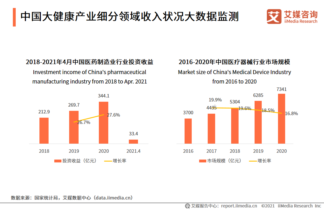 得益于大健康產(chǎn)業(yè)發(fā)展以及疫情期間醫(yī)藥需求增長(zhǎng),醫(yī)藥制造、醫(yī)療器械等大健康細(xì)分領(lǐng)域都表現(xiàn)良好。iiMedia Research(艾媒咨詢)數(shù)據(jù)顯示,2020年,中國(guó)的醫(yī)藥制造業(yè)投資收益達(dá)到344.1億元,同比增長(zhǎng)27.6%;中國(guó)醫(yī)療器械行業(yè)市場(chǎng)規(guī)模超過7000億元,同比增長(zhǎng)16.8%。