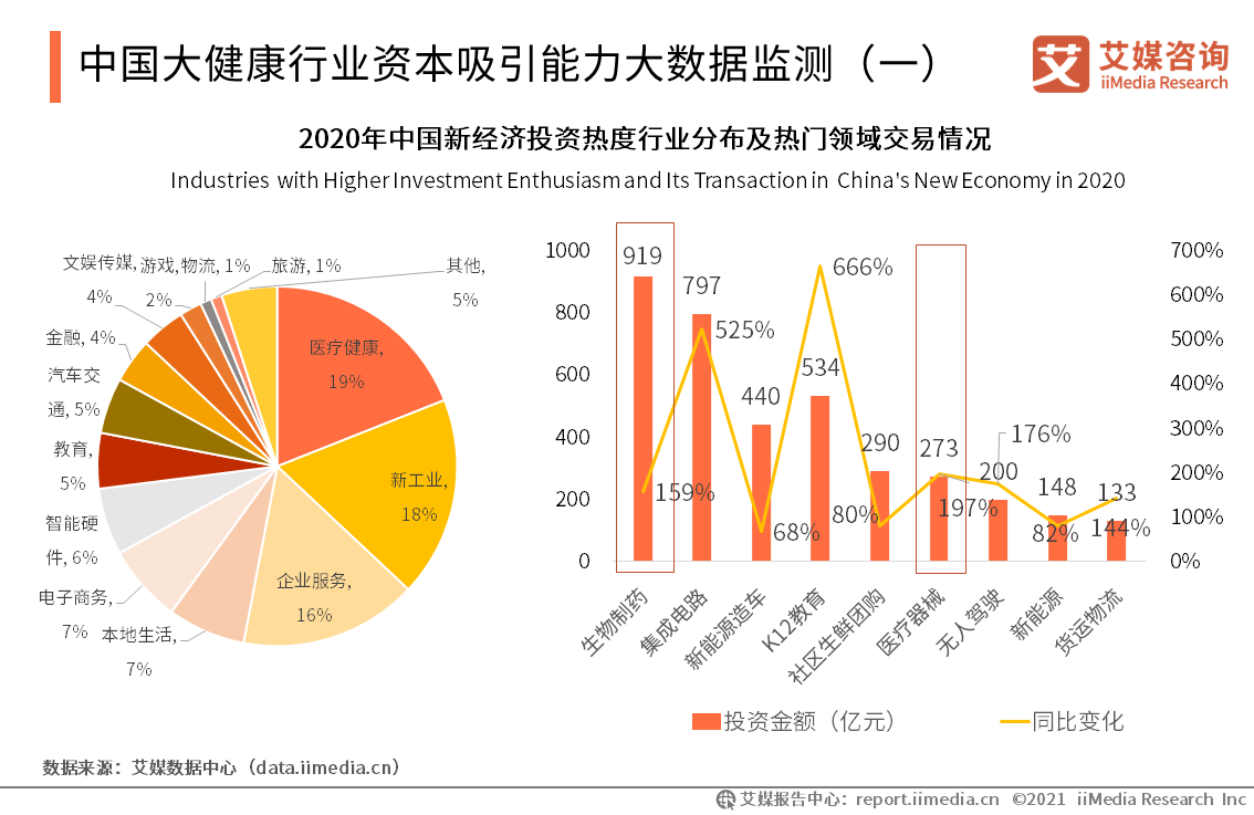 數(shù)據(jù)顯示,2020年中國(guó)投資熱度最高的新經(jīng)濟(jì)行業(yè)是醫(yī)療健康,投資項(xiàng)目占比19%。在熱門投資領(lǐng)域中,投資金額最高的是生物制藥,超過900億元,此外,大健康細(xì)分領(lǐng)域中的醫(yī)療器械也獲得了273億元的交易額。可見,疫情之下,大健康行業(yè)的融資熱度依然高漲。