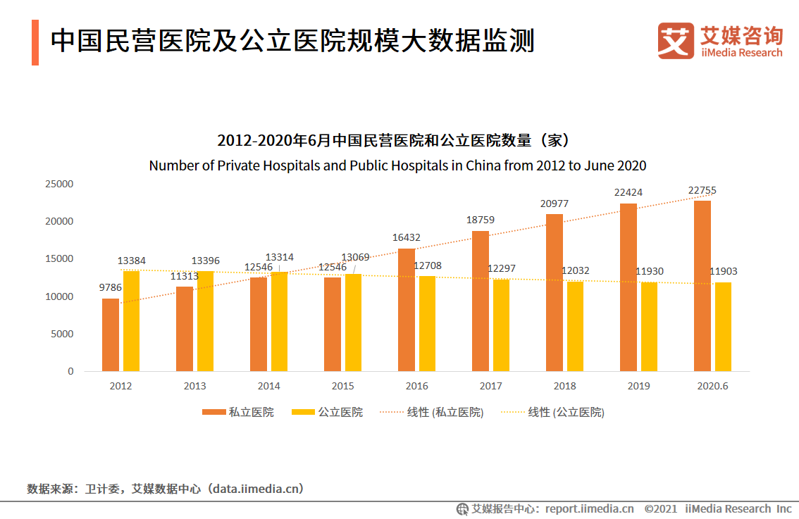 數(shù)據(jù)顯示,2012年到2020年6月中國(guó)的民營(yíng)醫(yī)院數(shù)量保持增長(zhǎng)態(tài)勢(shì),甚至在2016年首次超過了公立醫(yī)院的數(shù)量。2020年6月,中國(guó)民營(yíng)醫(yī)院的數(shù)量已經(jīng)達(dá)到22755家,接近公立醫(yī)院的2倍,發(fā)展速度非常快。相比之下,公立醫(yī)院數(shù)量增長(zhǎng)從2012年開始呈現(xiàn)不斷縮減的趨勢(shì)。公立醫(yī)院保持存量進(jìn)行改革、民營(yíng)醫(yī)院市場(chǎng)需求激活的趨勢(shì)明顯。