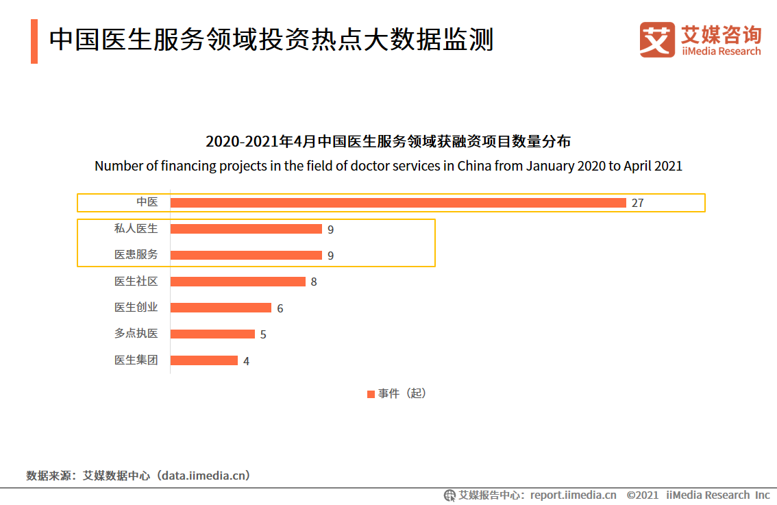 在多元辦醫(yī)的主體中,民營(yíng)醫(yī)院是社會(huì)資本進(jìn)入的重要撬動(dòng)點(diǎn),而醫(yī)生集團(tuán)以及高端醫(yī)療服務(wù)是受關(guān)注的二級(jí)市場(chǎng)。2020-2021年7月中國(guó)醫(yī)生服務(wù)類投資項(xiàng)目數(shù)分布中,中醫(yī)領(lǐng)域獲得資本關(guān)注度最高,有最多項(xiàng)目獲得融資,而私人醫(yī)生、醫(yī)患服務(wù)和醫(yī)生社區(qū)是值得關(guān)注的新的投資增長(zhǎng)點(diǎn)。