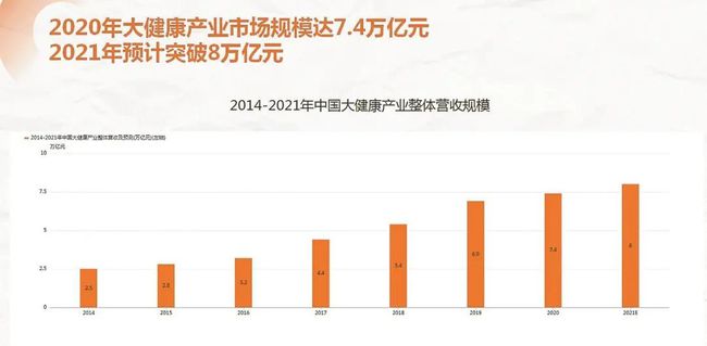 國家衛(wèi)生健康委官方網(wǎng)站發(fā)布的全國健康素養(yǎng)監(jiān)測結(jié)果顯示,全國居民健康素養(yǎng)水平逐年上升,與2015年相比,2020年國人健康意識上升了一倍。意識帶動需求,需求帶動購買力,與此對應(yīng)的是,中國大健康產(chǎn)業(yè)整體營收規(guī)模持續(xù)上升,2020年市場規(guī)模達(dá)7.4萬億元,2021年預(yù)計突破8萬億元。