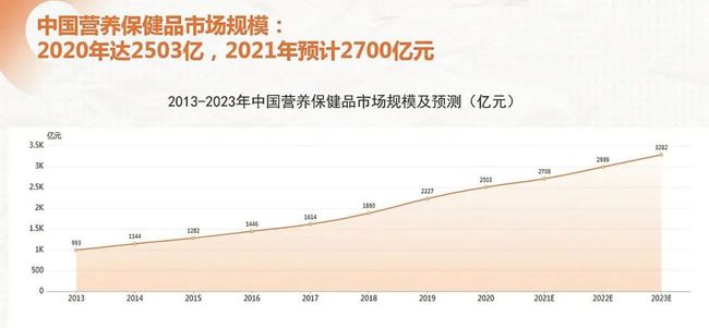 一塊錢預(yù)防能省下十塊錢的治療!醫(yī)學(xué)科普經(jīng)年累月強調(diào)"預(yù)防>治療",大眾的防病、保健、養(yǎng)生意識也逐年增強。報告顯示,中國營養(yǎng)保健品市場規(guī)模2020年達(dá)2503億,2021年預(yù)計2700億元。