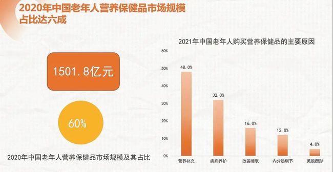 雖然說營養(yǎng)保健品的消費者中,60歲以上老年人僅僅占兩成,但他們市場規(guī)模占比達(dá)高達(dá)六成。這說明健康問題是老年人的剛需,和年輕人相比,他們更舍得為保健品花大錢。2020年中國老年人營養(yǎng)保健品市場規(guī)模已高達(dá)1501.8億元。