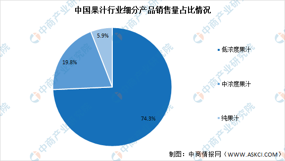 數(shù)據(jù)顯示,從零售市場結構來看,低濃度果汁為市場消費主流,低濃度果飲料零售量占果汁飲料總零售量的74.3%,中濃度果飲料零售量占果汁飲料總零售量的19.8%,純果汁零售量占果汁飲料總零售量的5.9%。