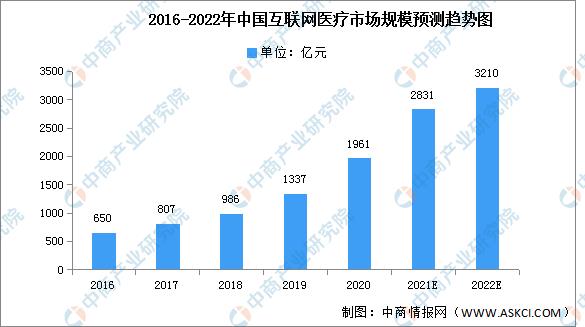 中國互聯網醫療市場由2016年的650億元增至2020年的1961億元,復合年均增長率為31.79%。隨著中國互聯網醫療行業的不斷發展,預計2022年市場規模將擴至3210億元。