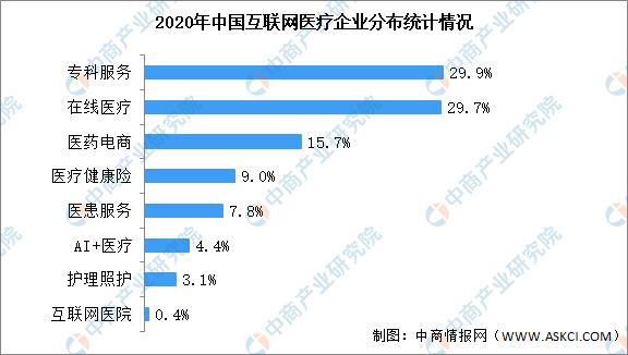 目前,行業內針對垂直領域的企業數量在不斷增加,且中游企業集中在互聯網巨頭、險資、第三方創業者及部分醫藥企業。數據顯示,2020年我國互聯網醫療企業分布前三為專科服務、在線醫療及醫藥電商,分別占比29.9%、29.7%及15.7%。