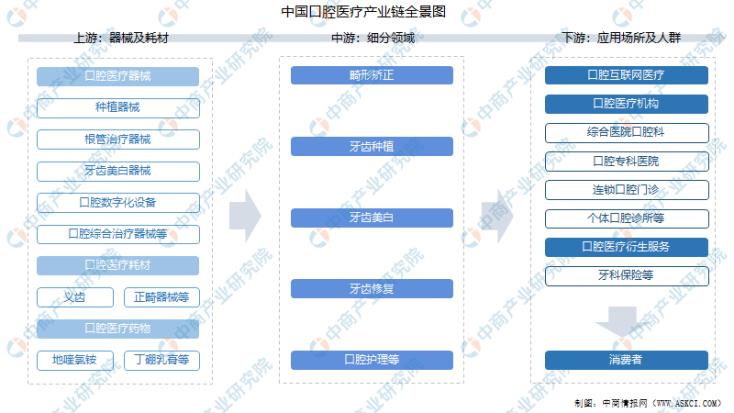 我國口腔醫療產業鏈中,上游為口腔醫療服務所需要的專用器械、專用耗材及醫療藥物;中游為口腔醫療服務,主要包括牙齒畸形矯正、牙齒種植、牙齒美白、牙齒修復及口腔護理等;下游為口腔醫療機構及衍生服務,最后服務于終端消費者。