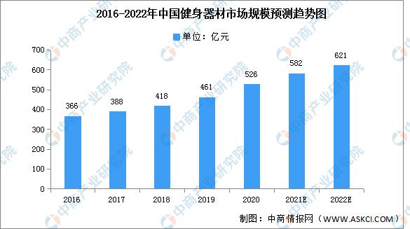 隨著我國健身相關政策的推行,國民健身意識不斷增強。近年來,中國健身器材市場規模保持增長趨勢,從2016年的366億元增長至2020年的526億元,年均復合增長率達9.49%,預計2022年將進一步增長至621億元。