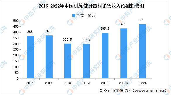 2016-2020年中國訓練健身器材行業的銷售收入有所波動,期間2018-2019年市場規模出現下降后,2020年因為疫情限制出行使銷售收入得到恢復,同比增長32.8%,達395.2億元,預計2022年將增長至471億元。