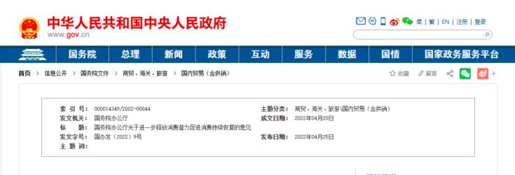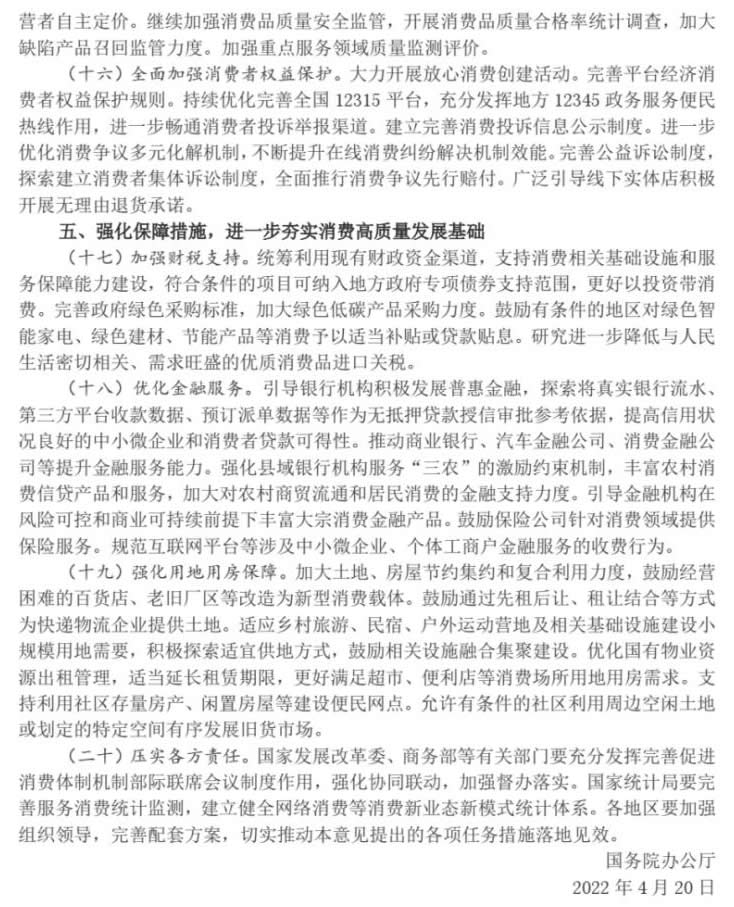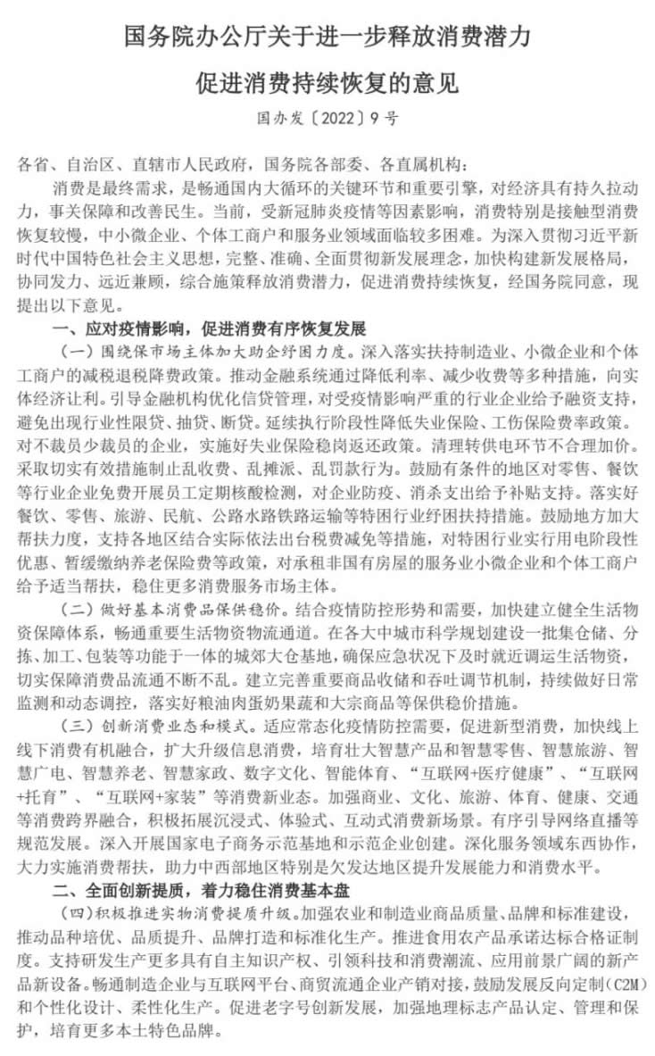消費是最終需求,是暢通國內大循環的關鍵環節和重要引擎,對經濟具有持久拉動力,事關保障和改善民生。當前,受新冠肺炎疫情等因素影響,消費特別是接觸型消費恢復較慢,中小微企業、個體工商戶和服務業領域面臨較多困難。為深入貫徹習近平新時代中國特色社會主義思想,完整、準確、全面貫徹新發展理念,加快構建新發展格局,協同發力、遠近兼顧,綜合施策釋放消費潛力,促進消費持續恢復,經國務院同意,現提出以下意見。