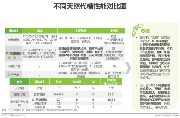 上文可以發現赤蘚糖醇是眾多現有代糖中的相對最優解,但是作為糖醇類的一種存在天然缺陷,長期使用對腸胃耐受能力弱的人會形成消化負擔,引起脹氣或腹鳴,并且作為當前市場最火爆原料,需求暴漲的局勢下,其單位成本也有所上漲。所以科學家、原料生產商也在不停探索更優解,希望找到量價、屬性等各方面更優秀的原料成分,優化赤蘚糖醇不足同時給予市場更多發展空間。我們對相關學術文章、科研成果進行研究發現阿洛酮糖、阿拉伯糖和塔格糖性能表現更優,其中阿洛酮糖綜合各方優勢最有可能成為代糖物質更優解落地應用。