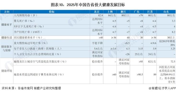 “十四五”期間,我國主要省市也提出了人民衛生健康的發展目標。其中,北京、上海、浙江、廣東等均從人民健康水平、健康生活、健康服務與保障、健康環境的角度提出總體規劃。