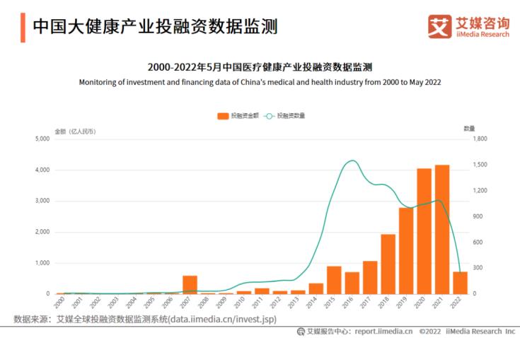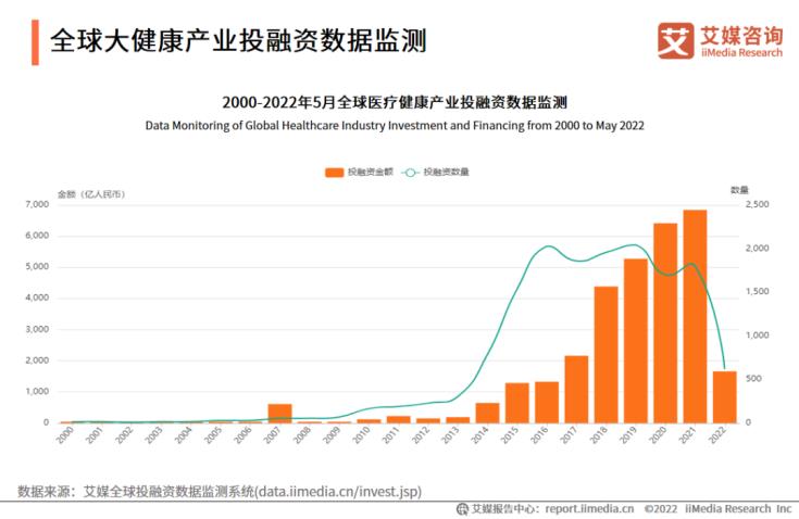 iiMedia Research(艾媒咨詢)數(shù)據(jù)顯示,全球醫(yī)療健康產(chǎn)業(yè)投融資金額最多集中在2021年,全年達(dá)到6846.03億元,投融資數(shù)量最多在2019年,達(dá)2044起。艾媒咨詢分析師認(rèn)為,在新冠疫情的沖擊下,近兩年來(lái)全球健康意識(shí)不斷增強(qiáng)。隨著人們的健康需求不斷上升,全球大健康產(chǎn)業(yè)也得到越來(lái)越多資本的關(guān)注。