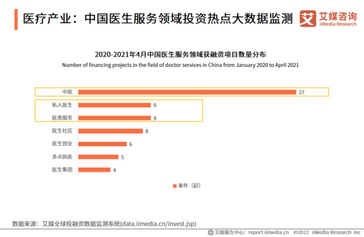 在多元辦醫(yī)的主體中,民營(yíng)醫(yī)院是社會(huì)資本進(jìn)入的重要撬動(dòng)點(diǎn),而醫(yī)生集團(tuán)以及高端醫(yī)療服務(wù)是受關(guān)注的二級(jí)市場(chǎng)。2020-2021年4月中國(guó)醫(yī)生服務(wù)類投資項(xiàng)目數(shù)分布中,中醫(yī)領(lǐng)域獲得資本關(guān)注度最高,有最多項(xiàng)目獲得融資,而私人醫(yī)生、醫(yī)患服務(wù)和醫(yī)生社區(qū)是值得關(guān)注的新的投資增長(zhǎng)點(diǎn)。